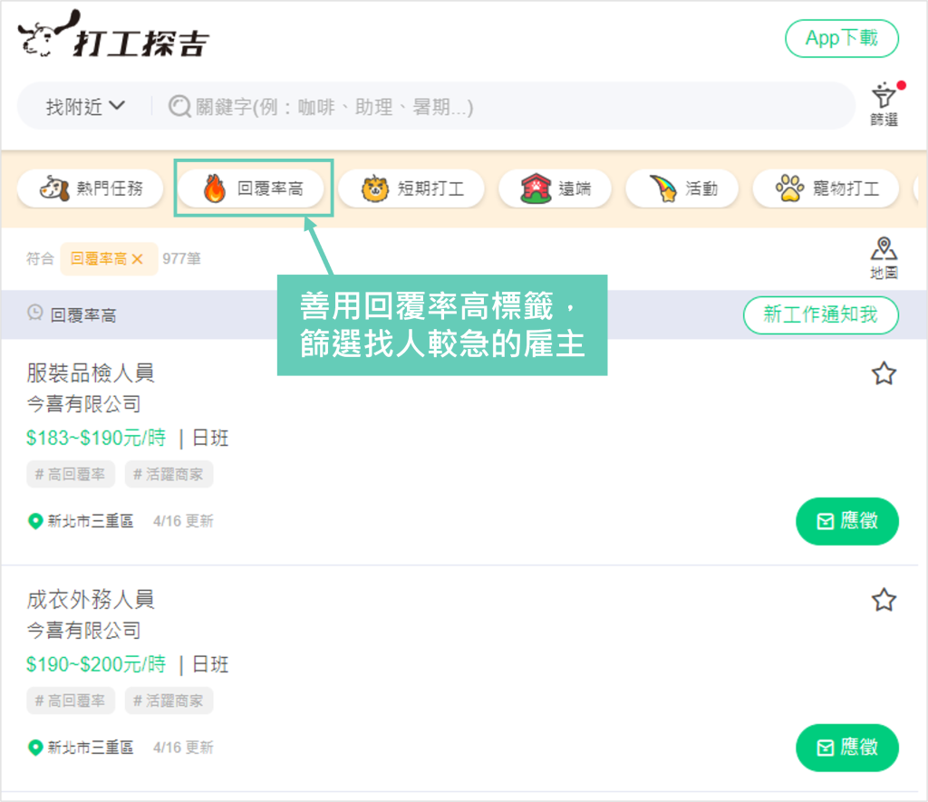 - 善用打工探吉標籤回覆率高,尋找找人較急的打工,提高面上上工的機會。