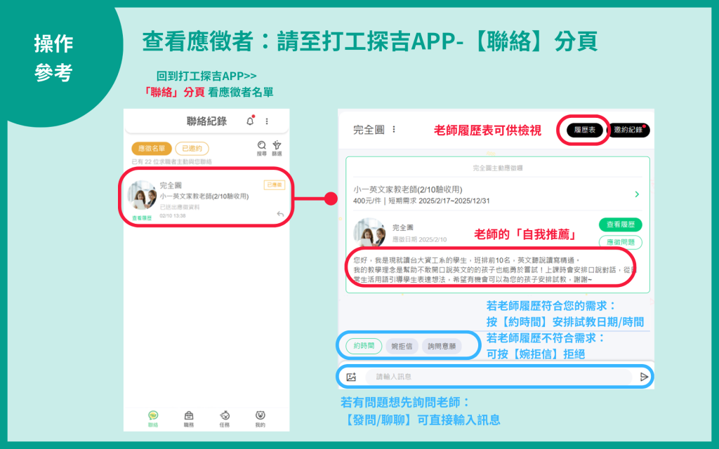 當您在打工探吉使用【個人刊登】刊登家教案件後,要怎麼查看應徵者履歷呢?如果該應徵者符合、不符合您的需求條件,如何在APP操作以聯繫合適老師、婉拒不合適老師。本篇手把手教你操作!