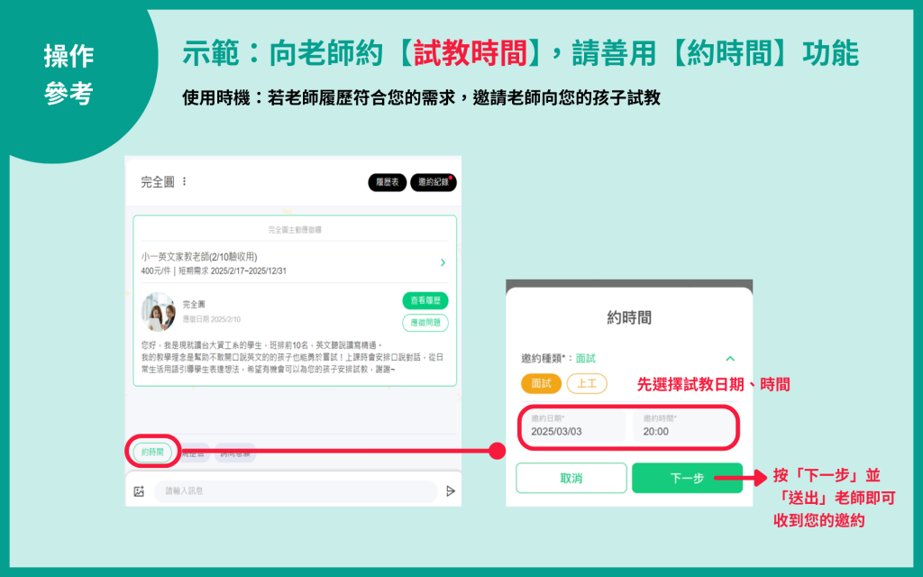 示範A:向老師約【試教時間】,請善用【約時間】功能
