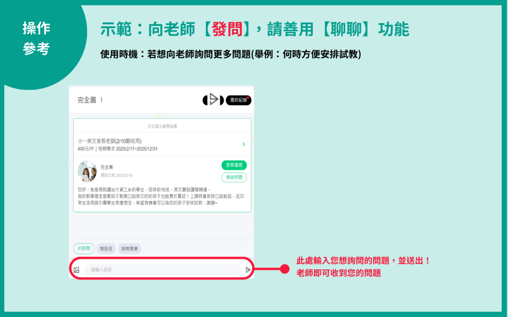【步驟2】看過應徵者的履歷與自我推薦信後,可以「發問」、「約試教時間」、「婉拒」