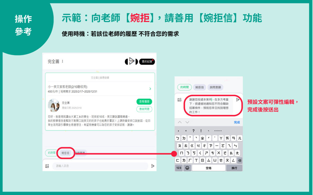 | 婉拒 | 若該位老師的履歷 不符合您的需求,可直接寄婉拒信。 |
