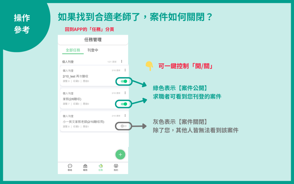 - 綠色:表示【案件公開】,求職者可看到您刊登的案件